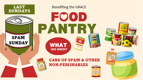 Bring canned foods and other non-perishables to Fellowship Hall the last Sunday of each month for distribution to the GRACE Food Pantry clients. You don’t have to wait until the last Sunday, though; bring canned items and other shelf-stable foods any time during the month and place in the marked receptacle in Fellowship Hall. PLEASE ENSURE THAT YOUR ITEMS ARE NOT EXPIRED.