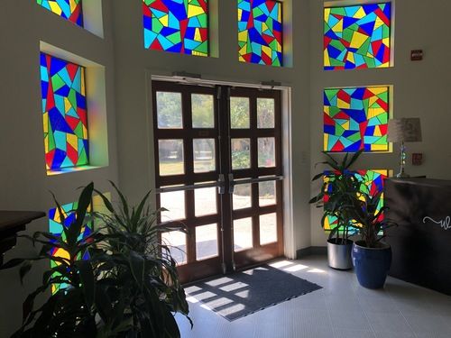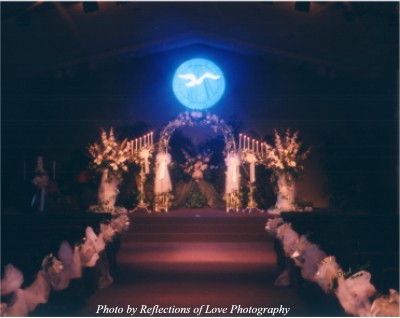 The chapel can accommodate up to 250 guests and is equipped with a state-of-the-art audio and video system. With recessed lights on rheostats, we can create amazing lighting effects and the most romantic ambiance. A large stained glass window of a white dove set against a beautiful cobalt blue background provides a stunning backdrop.